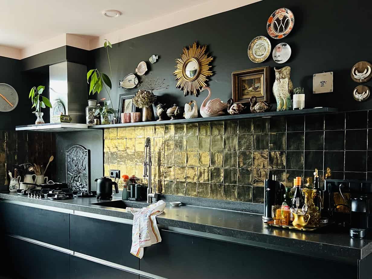 Een keuken is in de eerste plaats natuurlijk een functionele ruimte maar aangezien bij mij elke ruimte een plek is waar ik lekker los gaan gaan met styling, gebeurt dat ook in de keuken. De goudkleurige tegels glinsteren je tegemoet, alle muren hebben een kleur, inclusief het plafond en er staat van alles op de lange plank boven het aanrecht. Wil jij ook meer sfeer in je keuken? Je hoeft het niet zo bont te maken als ik maar ik heb wel een paar simpele, snelle stylingtips voor je keuken waarmee je makkelijk meer sfeer geeft. Nu bijna iedereen een open keuken heeft, is het wel zo leuk als de sfeer van je keuken aansluit bij die van je woonkamer.