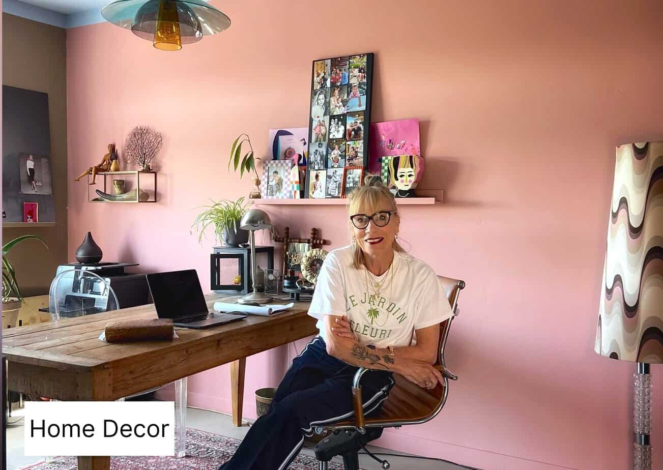 Om lekker te werken is de sfeer van je werkruimte heel belangrijk. In mijn geval heb ik een super sfeervolle thuiswerkplek die heel kleurrijk is (hoe kan het ook anders) met een roze muur en een lichtblauw plafond.