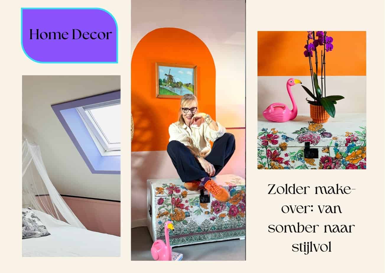 Tot slot verfde ik de kozijnen van de twee zolderraampjes lila, zette een keurrijke dekenkist neer en gaf mijn donkerbruine kast ook wat kleuraccenten.